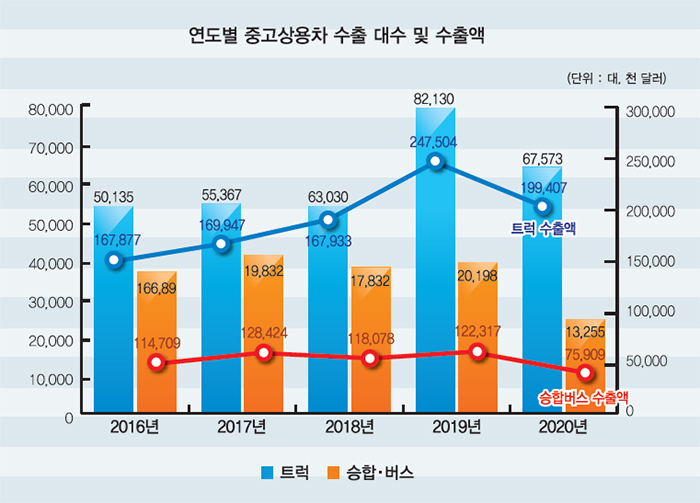 지난해 겪은 중고상용차 수출 급감에 한풀이라도 하듯, 올 들어 중고트럭과 승합·버스 수출이 드라마틱한 반전을 이뤘다. 되레 작년 감소분까지 흡수하며, 코로나19가 강타하기 이전보다 높은 성적을 보이고 있는 것. 중고상용차 수출 통계 관측 이래로 상반기 기준 역대 최고 수출대수도 경신했다.