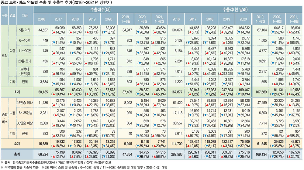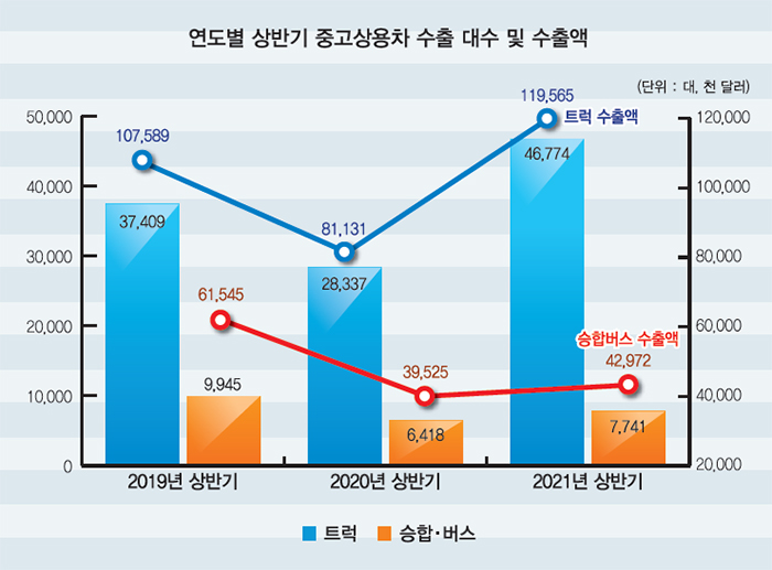 2016년 이후 연이어 상승곡선을 그렸던 중고트럭 및 승합·버스 등 중고상용차 수출시장이 지난해 코로나19의 영향으로 급격한 침체를 겪었다. 하지만 올해 초에 접어들며 반등하기 시작한 수출이 상반기 내내 호조세를 보이며, 상반기 수출대수 기준으로 역대 최대 기록을 갈아치웠다.