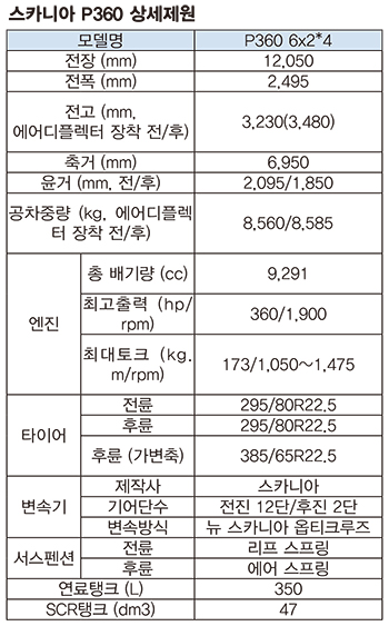 이달 출시한 P360은 스카니아코리아가 처음으로 공개하는 준대형트럭 라인으로, 중형트럭의 경제성과 대형트럭의 성능을 두루 갖추고 있다. 준대형급 모델에 대한 시장의 지속적인 수요를 적극 반영해 제품을 개발하였으며, 이번 출시로 중형부터 준대형, 대형까지 아우르는 카고트럭 풀 라인업을 완성했다.