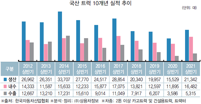 2018년 이전까지만 해도 국산 준중형 및 중대형트럭의 반기별 수출량은 1만 대 이상을 유지하며, 내수와 수출이 약 6대 4 수준을 유지했으나, 현재는 내수시장에 대한 의존도가 높아졌다. 수출량이 떨어진 만큼, 생산에도 영향을 미쳤다.