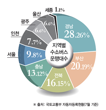 수소버스 보급에 가장 적극적인 지역은 경남 창원과 부산이다. 두 지역이 지난 7월까지 도입해 운행 중인 수소버스는 총 48대로 이는 전국 수소버스(106대)의 45.3%에 이른다. 두 지역은 전국에서 가장 많은 수소충전소를 보유하고 있는 등 ‘수소특화도시’를 표방하며 수소버스 도입에 적극적인 행보를 보이고 있다.