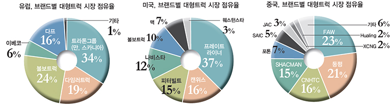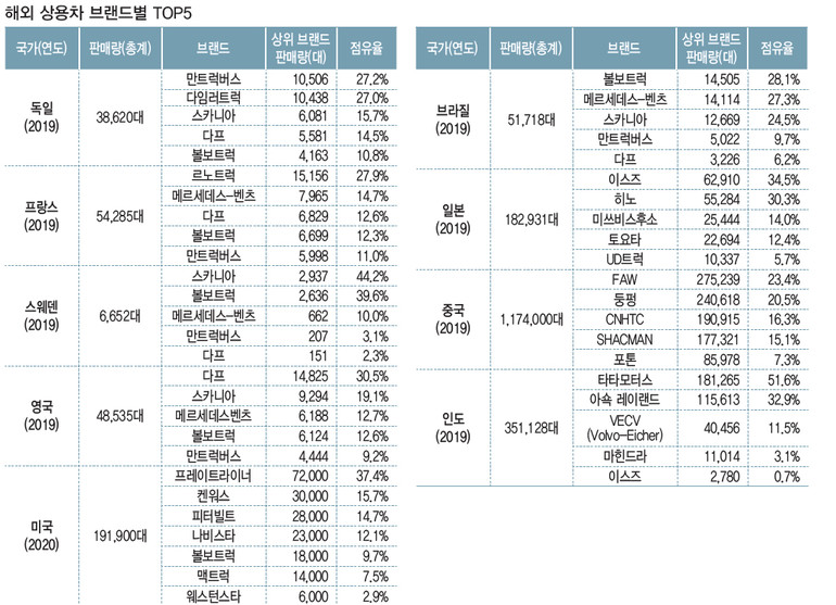 그렇다면 대형트럭 기준으로, 세계 각국의 상용차 시장에선 어떤 브랜드가 활약하고 있을까.