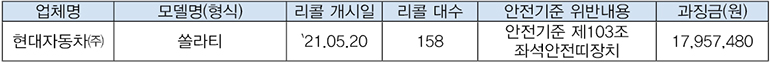 현대자동차㈜에서 제작, 판매한 쏠라티 158대는 좌석안전띠 부착장치가 안전기준*에 미달되어 과징금 18백만 원을 부과한다.