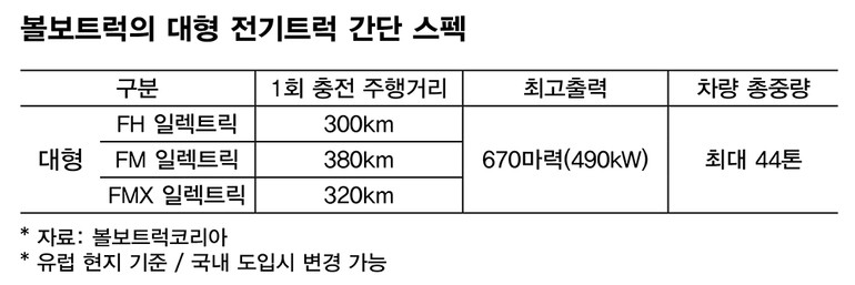 총중량 40톤급의 대형 전기트럭인 FH, FM, FMX 일렉트릭은 한 번 충전에 최대 300km(배터리 충전율 80%, 유럽 현지 기준)를 달리며, 배터리 용량은 최대 540kWh로 운송 목적 및 주행거리에 따라 배터리 팩 개수(4~6개)를 선택할 수 있다. 또 13ℓ급 디젤 엔진을 능가하는 최고출력 670마력(490kW)과 최대토크 244.89kg.m(2,400Nm)를 발휘하며, 12단 변속기를 탑재해 운행 효율성을 높였다.