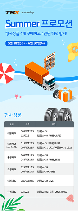 구체적으로 행사 대상 카고‧덤프트럭용 타이어 4개를 구매하면 총 4만 원 상당의 혜택이 제공된다. TBX 멤버십 회원으로부터 여름 프로모션 쿠폰을 선물 받아 타이어 6개를 구매할 경우엔 최대 6만 원 혜택도 제공받을 수 있다.