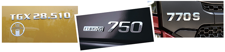 차체에 붙은 엠블럼과 문자 그리고 숫자를 ‘레터링(Lettering)’이라고 하는데 유럽의 트럭들은 과거 1980년대 출력 경쟁 시절부터, 성능을 과시하기 위해 실린더 개수나 엔진출력을 표기한 것이 시초다. 통상적으로 캡 사이즈, 배기량, 엔진출력, 적재능력 등 브랜드에서 내세우고 싶은 핵심 제원을 부착한다.
