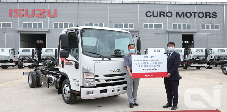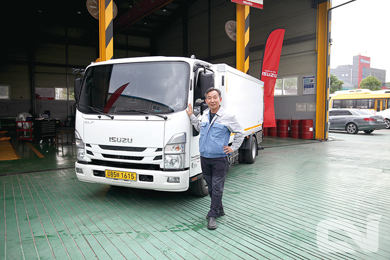 코로나 사태 이후 약 2년 반 만에 진행되는 이스즈 트럭 대면 서비스캠페인에 반가운 이가 트럭 점검 차 방문했다. 정확히 1년 전 출시된 2.5톤 엘프 저상트럭의 1호차 주인공 노종희 씨였다.