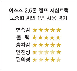 1년간 겪은 2.5톤 엘프 저상트럭에 대한 총평을 묻는 기자의 질문에 노 씨는 “변속감과 출력, 승차감과 안전성 여기에 편의성까지 모두 별 5개를 꽉 채워서 평가하고 싶습니다. 제게 돈 벌어다 주는 트럭으로서 매우 만족스러운 지난 1년간의 동행이었습니다.”고 대답했다.