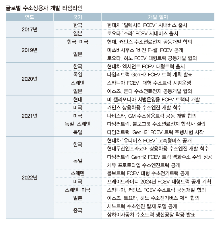 한국과 일본은 2017년 수소전기버스 개발 양산 등 수소전기 분야에 많은 투자를 해 온 반면, 유럽은 최근까지만 해도 전기트럭에 집중하는 모양새였다. 미디어를 통해 공개한 모델 대다수가 중대형급 전기트럭이다. 그러다 2020년부터 볼보트럭, 다임러트럭, 스카니아 등 유수의 유럽 상용차 브랜드들이 수소전기트럭의 개발 및 운용 계획을 발표하기 시작했는데, 한국과 일본 상용차 브랜드가 애먹고 있는 수소연료전지를 독자개발이 아닌 합작 및 협력관계로 풀어나간다는 구상이다.