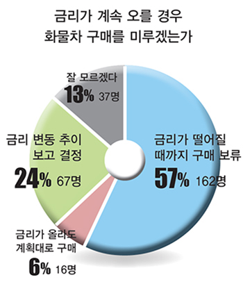 실제로 본지가 지난달 영업용 화물차주 282명을 대상으로 설문조사를 진행한 결과, ‘대출금리가 계속 오를 경우 화물차 구매를 미룰 의향이 있느냐’는 질문에 ‘금리가 떨어질 때까지 미룰 것이다’고 답한 차주가 57%(162명)로 가장 많았고, 이어 ‘금리 변동 추이를 살펴보고 결정하겠다’는 응답이 24%(67명)로 뒤를 이었다. ‘금리가 얼마나 오르든 계획대로 구매하겠다’고 답한 차주는 6%(16명)에 불과했다.