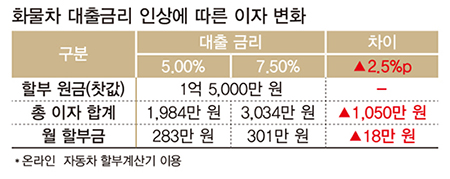 그렇다면 찻값이 1억 5,000원인 대형카고를 전액 할부(60개월)로 구매할 경우, 금리 인상에 따른 이자 부담은 어느 정도일까. 온라인 ‘자동차 할부 계산기’를 이용해 계산한 결과, 대출금리(고정금리 기준)가 연 5%에서 7.5%로 오를 경우 내야 하는 총 이자는 약 1,050만 원 늘어나는 것으로 나타났다.