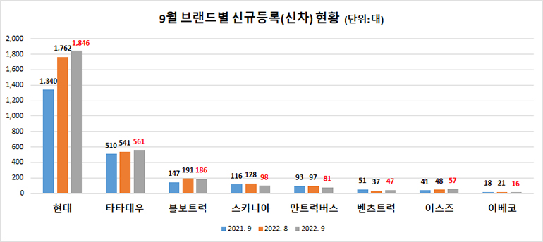 브랜드별로 보면, 현대자동차가 1,846대로 전년 동기대비 37.8%, 전월 대비 4.8% 증가했다. 이어 타타대우상용차 561대(▲10.0%, ▲3.7%), 볼보트럭코리아 186대(▲26.5%, ▼2.6%), 스카니아코리아 98대(▼15.5%, ▼23.4%), 만트럭버스코리아 81대(▼12.9%, ▼16.5%), 메르세데스-벤츠트럭 47대(▼7.8%, ▲27.0%), 이스즈 57대(▲39.0%, ▲18.8%), 이베코코리아 16대(▼11.1%, ▼23.8%)를 기록했다.