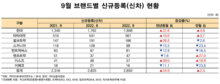 국토교통부의 차량 등록 원부 데이터를 가공, 본지에 독점 제공하고 있는 카이즈유데이터연구소 통계에 따르면, 준중형급 이상 카고트럭(특장차 포함) 및 트랙터 등 운송용 트럭, 15톤 및 25.5톤 이상 덤프트럭 및 믹서트럭(6루베 이상) 등 건설용 트럭의 지난 9월 한 달간 판매량(신차 신규등록 기준)은 2,892대를 기록했다.