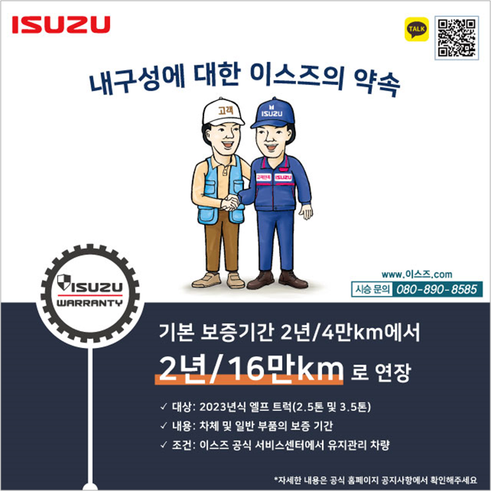 이 외에도 큐로모터스는 23년식 이스즈 3.5톤 엘프와 기존에 출고된 2.5톤 엘프에 대해 기존 2년/4만km(선도래 기준)의 보증기간을 2년/16만km(선도래 기준)까지 무상보증기간을 크게 연장키로 했다. 다만 전국 30개 이스즈 공식 서비스센터에서 엔진오일 등의 정기 유지관리가 선제돼야 되며, 소모품은 보증 범위에 포함되지 않는다.
