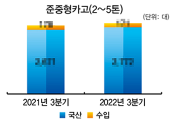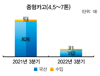 올해 3분기 적재중량 4.5~7톤 중형카고는 총 183대 판매되며 전년 동기(879대) 대비 79.2% 감소했다. 국산과 수입산 모두 하락을 면치 못했으며, 사상 처음으로 중형카고 시장에서 현대차가 자취를 감췄다.