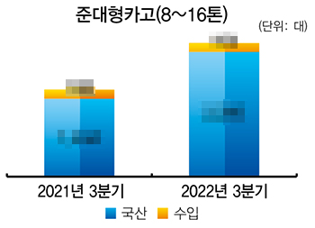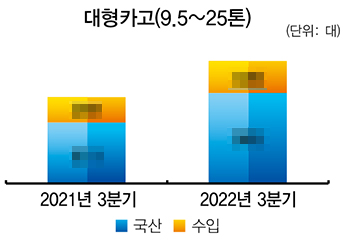 올해 3분기 적재중량 9.5~25톤 대형카고 판매량은 1,304대로 전년 동기(920대) 대비 41.7% 증가한 것으로 나타났다. 국산 및 수입산 판매량 모두 지난해와 비교해 두 자릿수 수준 성장했다.