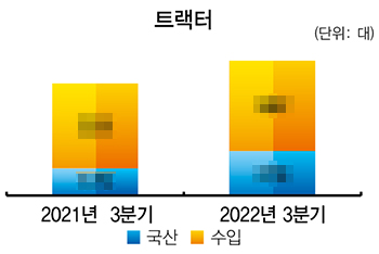 올해 3분기 트랙터 판매량은 총 840대로 전년 동기(699대) 대비 20.2% 증가했다. 트랙터 시장은 지난 1년간 물류 적체 및 부품 수급난으로 저조한 성적을 기록했으나 올해 하반기 들어 각종 악재 완화로 정상 수요를 되찾은 모습이다. 특히 국산 모델의 증가폭이 약 64%로 두드러졌다.