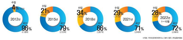 수입산 대형카고 점유율은 2012년 당시 4.3% 수준이었으나, 유로6 배기가스 규제 시행 직후인 2015년 점유율은 25.8%, 2018년에는 점유율 34%까지 치솟았다. 2019년 30.8%, 2020년 31.5%, 2021년 28.6%로, 2017년 이후 6년째 점유율 30% 언저리에서 웃돌고 있는 것으로 나타났다.