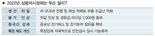 부품 수급난, 러시아-우크라이나 전쟁, 고물가, 고금리 등 올해 전 세계를 강타한 악재 앞에 국내 상용차시장의 날개가 꺾였다. 지난해 말부터 회복세를 그리던 트럭 신차 시장은 감소세로 돌아섰고, 급격히 치솟은 물가에 화물차 운전자들의 신음은 더욱 커졌다. 이러한 가운데 중국산 전기상용차의 국내 진출이 가속화되면서 시장 판도에 변화가 감지됐으며, 정부는 침체기를 겪는 특장 업계 지원 사격에 나섰다. 올해 상용차 업계의 주요 이슈 거리를 요약해본다.