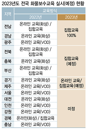 화물보수교육을 주최하는 지자체 교통연수원에서는 약 3년간 실시간 화상교육 등 온라인교육 방식으로 임시 전환해 교육을 진행해왔으나 최근 사회적 거리두기가 해제됨에 따라 내년부터 화물보수교육을 집합교육으로 전환하는 방안을 고려하고 있는 것으로 확인됐다.