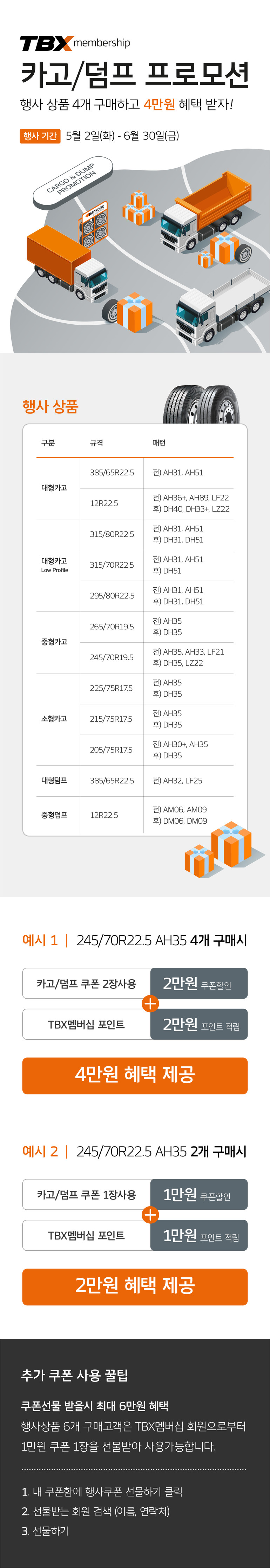 글로벌 선도 타이어 기업 한국타이어앤테크놀로지(주)(대표이사 이수일, 이하 한국타이어)가 이달부터 오는 6월 30일까지 약 2개월간 카고·덤프트럭용 타이어 프로모션을 진행한다.