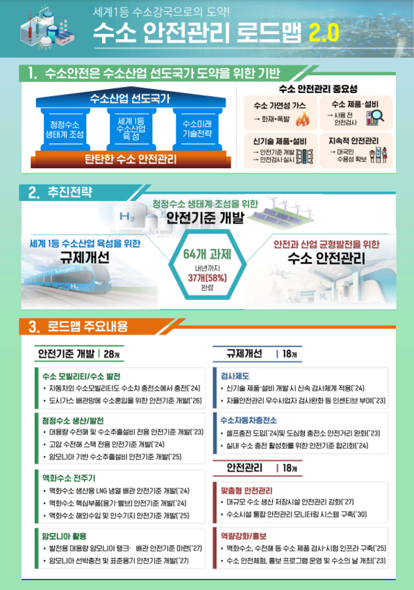 산업부는 지난해 6월부터 산학연 전문가 74명으로 구성된 ‘수소안전정책위원회’ 열며, ▲청정수소 생태계를 위한 선제적 안전기준 개발 ▲세계 1등 수소산업 육성을 위한 규제혁신 ▲안전과 산업의 균형을 위한 안전관리 등 3대 전략과 10대 추진과제, 64개 세부과제를 발굴했다고 9일 밝혔다.