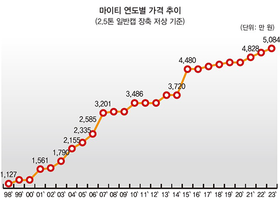 현대자동차의 간판 트럭 중 하나인 준중형급(2.5톤~4톤) ‘마이티’. 이 트럭의 가장 낮은 사양(내로우캡 제외)인 적재중량 2.5톤 일반캡 장축 저상 모델이 올 들어 5,000만 원(부가세 포함, 이하 동일) 대 벽을 넘겼다. 1998년에 출시된 ‘2세대 마이티’ 판매가격(1,100만 원) 대비 25년동안 4.5배 인상된 셈이다. 참고로 승용 부문에서 비슷한 가격대를 보면, 1998년 당시 현대차 ‘EF 쏘나타’의 무옵션 최저 트림은 1,189만 원이었다. 2023년 현재는 현대차 ‘제네시스 GV70’의 무옵션 최저 트림(4,995만 원)과 맞먹는다.