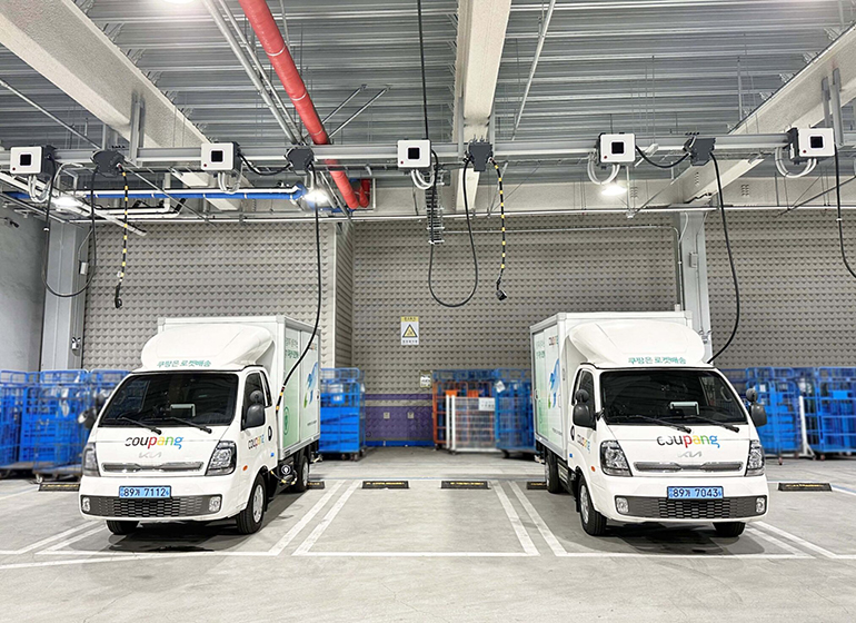 쿠팡이 2021년 오픈한 제주3캠프는 전기화물차의 이동 동선, 충전 효율화 등 유통물류 환경에 최적화된 천장형 중속 충전시스템이 국내 최초로 도입된 전기차 통합 배송센터로 배송 업무 전후 쿠팡친구가 카드를 단말기에 태그하여 천장에 달린 충전기를 차량과 연결하면 365일 24시간 언제든 충전이 가능하다.