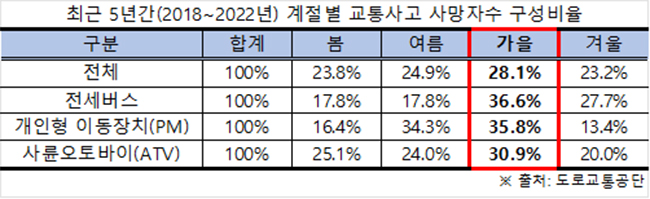 차종별로 살펴보면 가을철 사망자수비율이 가장 높은 차량은 전세버스(36.6%)였으며, 개인형 이동장치(PM), 사륜오토바이(ATV)가 그 뒤를 따랐다.