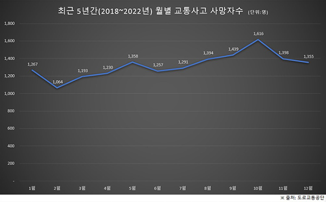 도로교통공단이 최근 5년간(2018~2022년) 월별 교통사고 통계를 분석한 결과, 5년간 교통사고 사망자 1만 5,862명 중에서 가을철(9~11월)에 발생한 사망자 수는 4,453명(28.1%)으로 다른 계절과 비교해 높게 나타났다. 10월에 발생한 교통사고 사망자 수가 1,616명(10.2%)으로 연중 가장 많았고, 9월이 1,439명(9.1%)으로 두 번째로 많았다.