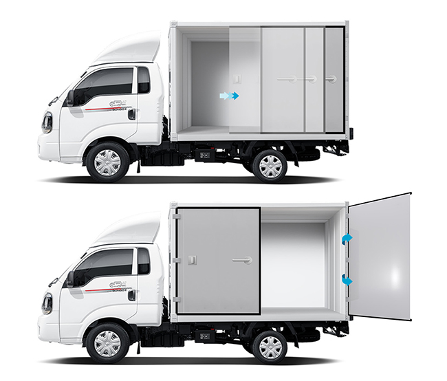스윙&슬라이딩 도어는 말 그대로 적재함 양 측면 도어를 스윙과 슬라이딩 방식 모두 가능하도록 만든 것으로 특히, 슬라이딩 방식은 기아 카니발의 사이드도어처럼 열리는 문 고정된 문의 바깥쪽으로 열리도록 설계해 내부 공간 손실을 최소화한 것이 특징이다.