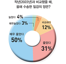 “작년(2022년)과 비교했을 때, 올해(2023년, 이하 동일) 수송한 일감의 양은 어땠나?”는 질문에 응답자(206명)의 50%가 ‘매우 줄었다’고 평가했으며, 31%는 ‘줄었다’고 응답했다. 이어 11.7%는 ‘비슷하다’, 3.9%는 ‘늘었다’, 2.9%는 ‘매우 늘었다’고 답했다. 전체적으로 응답자의 80% 이상이 일감이 준 것으로 답해, 운송 업계의 불황을 그대로 확인시켜주었다.
