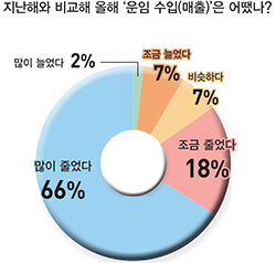 관련하여 “지난해와 비교해 올해 ‘운임 수입(매출)’은 어땠나?”라는 질문에 응답자 66%가 ‘많이 줄었다’고 답했으며, 18.5%는 ‘조금 줄었다’고 답했다. 전체적으로 응답자 84.5%가 운임 수입이 감소세를 경험했다. 일감 감소(80% 이상)와 매출 감소(84.5%)가 상관관계로 동시에 나타난 현상으로 보여진다. 이외는 ‘비슷했다’ 18.5%, ‘조금 늘었다’ 6.8%로 나타났으며 ‘많이 늘었다’는 1.9%에 불과했다.