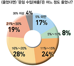 “(줄었다면) ‘운임 수입(매출)’은 어느 정도 줄었는가?”라는 질문에는 ‘16%에서 20% 정도 줄었다’고 답한 응답자가 28%로 가장 많았다. 이어 ‘11%에서 15% 정도’는 24%, ‘21%에서 30% 정도’ 19%, ‘5% 미만’ 17%, ‘5%에서 10% 정도’ 8%(14명), ‘30% 이상’ 4% 등으로 조사됐다.