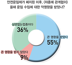 “지난해 말 컨테이너 및 시멘트 품목에 대한 안전운임제가 폐지된 이후, 올해 운임 수입에 악영향을 받았나?”라는 질문에 응답자 중 55%가 ‘큰 영향을 받았다’라고 답했다. ‘큰 영향을 받지 않았다’고 답한 응답자는 9%에 불과했다. ‘안전운임제와 상관없는 업종이다’라고 답한 응답자는 36%로 나타났다.