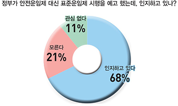 일몰된 안전운임제를 뒤이어 “(현)정부가 표준운임제 시행을 예고했다는 사실을 인지하고 있는가?”라는 질문에 응답자 10명 중 7명(68%)이 ‘인지하고 있다’고 답했다. 뒤이어 ‘모른다’는 21%, ‘관심 없다’는 11%로 집계됐다.