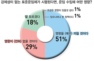 “안전운임제와는 달리 강제성이 없는 표준운임제가 시행된다면, 본인의 운임 수입에 영향을 끼칠 것으로 생각하는가?”라는 질문에, 응답자의 절반 이상(51%)이 ‘영향을 (매우)끼칠 것이다’라고 답했다. ‘영향이 (전혀)없을 것이다’는 29%에 불과했다. ‘잘 모르겠다’ 18%, ‘조금은 영향이 있을 것 같다’와 ‘있으나 마나 한 정책이다’라는 응답이 각 1%를 나타냈다.