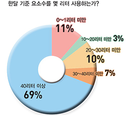 최근에 떠들썩했던 ‘요소수’에 대한 의견도 물어봤다. “한 달 기준으로 요소수를 몇 리터 사용하는가?”에 대한 질문에 응답자의 69%가 ‘40리터 이상’이라고 답했으며, ‘0에서 1리터 미만’이 11.7%, ‘20에서 30리터 미만’이 10%, ‘30에서 40리터 미만’ 7%, ‘10에서 20리터 미만’이 3%순으로 답했다.
