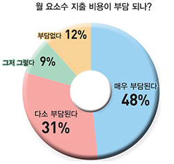 “월 요소수 지출 비용이 부담되는지?”에 대해 묻자 ‘매우 부담된다’를 택한 응답자는 절반 가량인 48%이었으며, ‘다소 부담된다’는 31%로 나타났다. 전체적으로 응답자의 79%가 요소수에 대한 비용 부담을 느끼고 있는 것으로 조사됐다. 이외 ‘부담 없다’가 11.6%, ‘그저 그렇다’가 8.7%로 집계됐다.