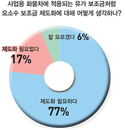 “유가 보조금처럼 요소수 보조금 제도화에 대해 어떻게 생각하는가?”에 대한 질문에는 ‘제도화가 필요하다’라는 의견이 77%로 응답자 대부분이 요소수 보조금 제도화에 찬성했다. ‘제도화 필요 없다’는 17%, ‘잘 모르겠다’는 6%를 차지했다.