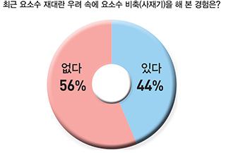 끝으로 “최근 요소수 재대란 우려 속에 요소수를 비축(사재기)해 본 경험이 있나?”라는 질문에 응답자 중 44%가 ‘있다’라고 답했고, 56%는 ‘없다’라고 답했다.