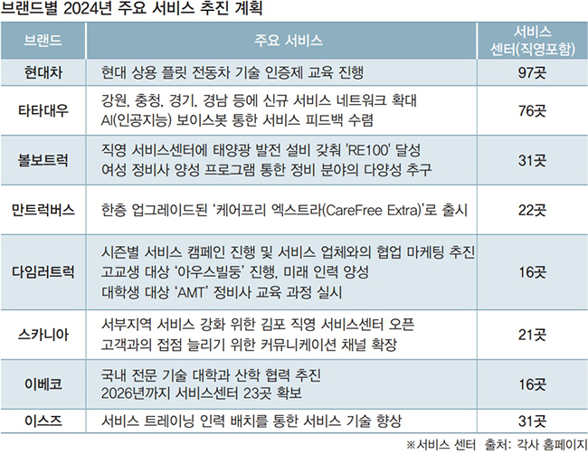 올 한 해 동안 현대자동차 및 타타대우상용차 등 국내 상용차 브랜드 2개사, 다임러트럭코리아, 볼보트럭코리아, 만트럭버스코리아, 스카니아코리아, 이베코그룹코리아, 이스즈코리아 등 수입 상용차 6개사 등 8개 상용차 브랜드는 제품력 강화와 동시에 고객 케어서비스 프로그램 품질을 대폭 개선해 대고객 만족도를 높여 나간다는 계획이다.