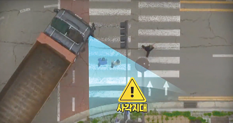 차체가 큰 대형 상용차의 경우 운전석과 우측 사이드미러의 거리가 멀어 우측 사각지대에 취약할 수 밖에 없다.