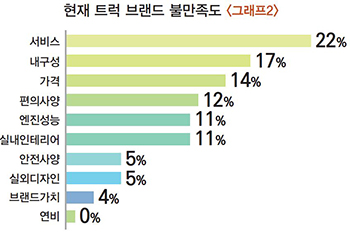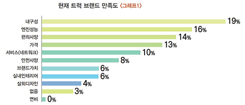 해당 질문에 대해 응답자 1명당 최대 2개의 답변을 받은 결과, 260명의 화물차주가 내놓은 481개 답변 중 19%는 ‘내구성’으로 나타났다. 이어 ‘엔진성능’이 16%, ‘편의사양’ 14%, ‘가격’ 13%, ‘서비스 품질’ 10% 등 순으로 만족하고 있었다.