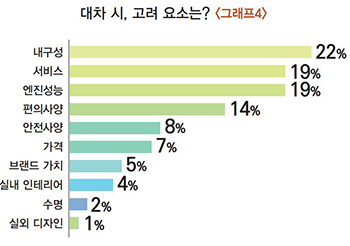브랜드를 변경하겠다고 답변한 응답자들은 그 이유(복수응답)로 ‘내구성’(22%), ‘서비스’(19%), ‘엔진성능’(19%), ‘편의사양’(14%) 등을 꼽았다.