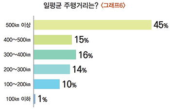 그 결과 설문에 응한 국내 화물차주들의 장거리 운행 비중이 높은 것으로 나타났다. 일평균 주행거리가 ‘500㎞ 이상’이라는 응답이 45%로 가장 많았으며, 하루 평균 300㎞ 이상 장거리 운행 비율은 75%에 달했다.