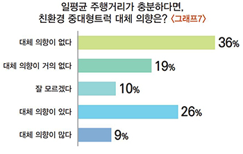 평소 운행하고 있는 일평균 주행거리를 1회 충전만으로 달릴 수 있다고 하더라도 친환경 트럭으로의 전환 의사는 높지 않았다. 대차 의향이 ‘없다’이거나 ‘거의 없다’는 부정적 견해가 55%로 과반을 넘었다.