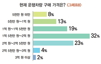 화물차주들이 응답한 현재 운용 중인 트럭의 구매 가격대는 ‘1억 5천만 원~2억 원’(32%), ‘2억 원~2억 5천만 원’(23%) 순으로 많았다.