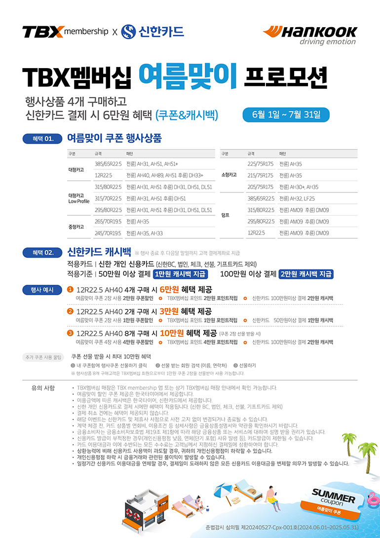 한국타이어는 행사기간 TBX 멤버십 회원 및 신규 회원을 대상으로 TBX 멤버십 매장에서 사용할 수 있는 1만 원 상당의 쿠폰 2매를 지급한다. TBX 멤버십 매장에서 타이어 행사 상품을 구입할 경우, 행사 상품 2개당 쿠폰 1장을 사용할 수 있다. 또한 맴버십 회원 간 2매의 쿠폰을 주고 받을 수 있어 1인당 최대 4장의 쿠폰을 사용할 수 있다.