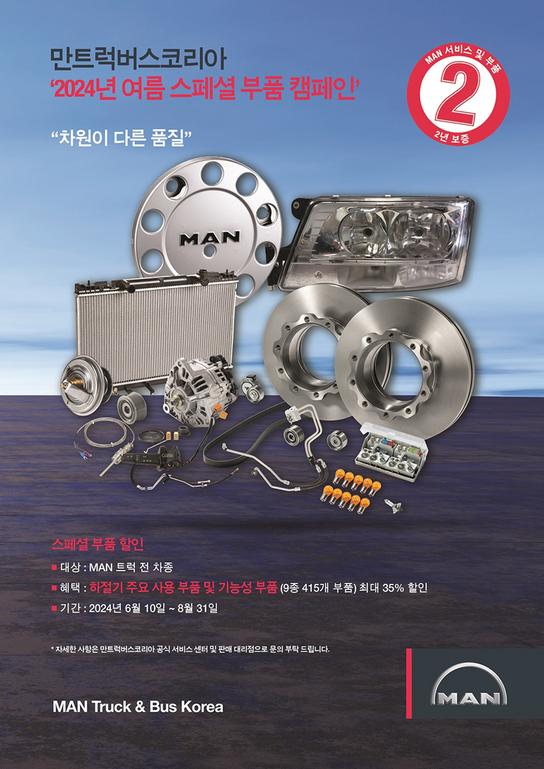 만트럭버스 그룹(MAN Truck & Bus SE)의 한국법인 만트럭버스코리아(이하 ‘만트럭’)가 10일부터 오는 8월 31일까지, 만트럭의 순정 부품을 합리적인 가격으로 제공하는 ‘2024년 여름 스페셜 부품 캠페인’을 실시한다.
